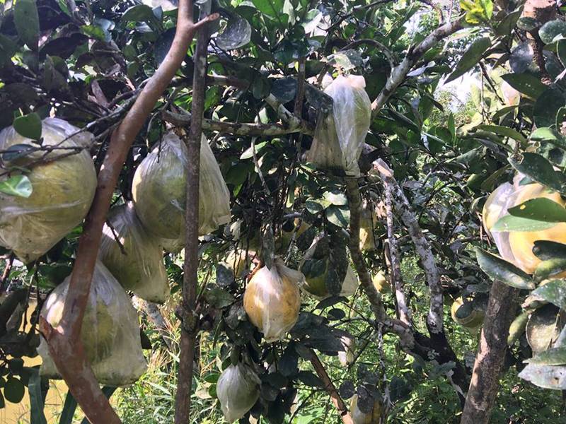 Bưởi Diễn khi đậu quả to bằng ngón tay thì ông Vỡn bọc kín lại bằng túi nilong ngừa ruồi vàng và các sinh vật gây hại khác