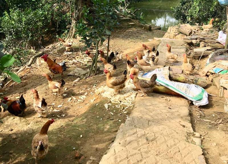 Gà chạy bộ được vợ ông Vỡi chăm sóc bằng ngô thóc và cây chuối rừng, có giá bán 150 nghìn đồng/kg. Theo ông Vỡi thì mỗi lứa ông nuôi khoảng 400 con, nhưng không đủ để cung cấp.