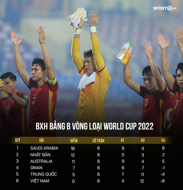 Bảng xếp hạng bảng B vòng loại 3 World Cup 2022 sau lượt trận thứ 6 (Ảnh: GN)