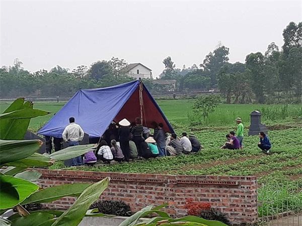 Gần cuối giờ chiều ngày 15/4, phần mộ của Hoàng A. đã cơ bản được hoàn thiện, người thân cũng đã trở về gia đình để lo những thủ tục tâm linh còn lại. Phía trên ngôi mộ mới xây, tấm bạt căng từ đầu giờ chiều vẫn để lại để che mưa cho cháu đêm nay.