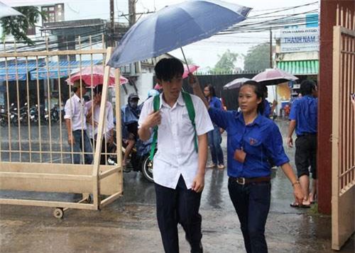 Một sinh viên tình nguyện đội mưa che cho sĩ tử.