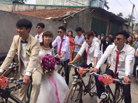 Kim Cương (một người bạn thân của chú rể) cho hay, mỗi chiếc xe đạp đều được sơn mới bằng màu xanh lá và dán chữ hỷ đỏ chót trên đầu. Riêng xe của chú rể còn được gắn một chiếc loa nhỏ, mở bài hát “Ông bà anh” cho “đúng không khí”.
