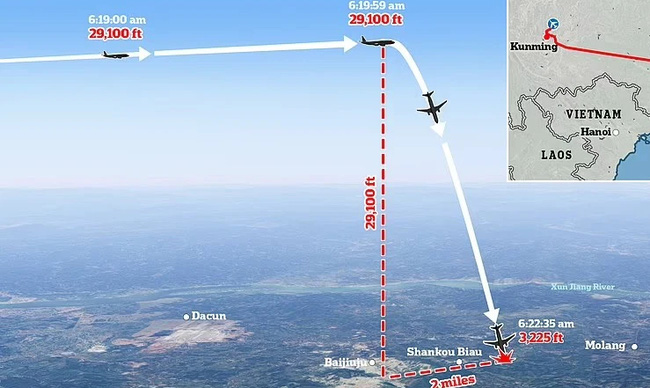 Dữ liệu của FlightRadar24 cho thấy vào khoảng 14 giờ 20 phút, tức hơn 1 tiếng sau khi cất cánh, máy bay bất ngờ lao xuống khi đang ở độ cao hơn 9.000m. Khoảng 2 phút 15 giây sau, dữ liệu cho thấy nó đã giảm xuống còn hơn 2.700 mét, tức máy bay đã rơi thẳng đứng xuống. Trong 20 giây tiếp theo, độ cao cuối cùng được ghi nhận là gần 1.000 mét. Đến 14 giờ 21 phút, máy bay mất liên lạc hoàn toàn với hệ thống giám sát.
