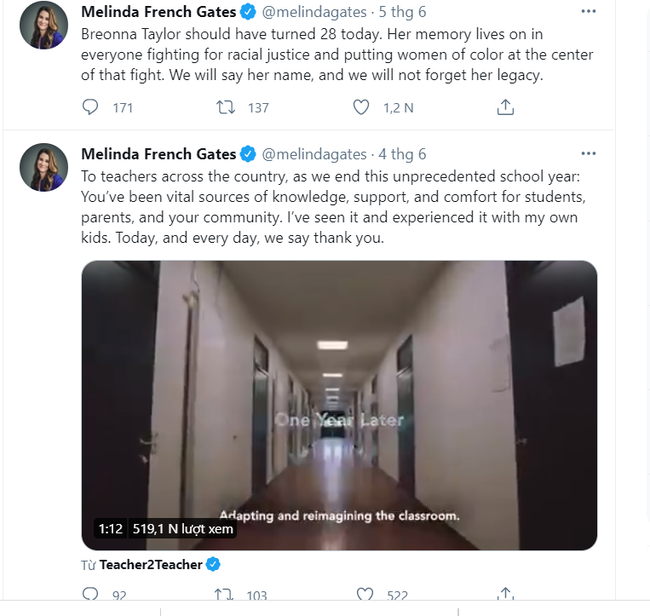 Đây là dịp hiếm hoi bà Melinda lên tiếng phản hồi khi có nhiều tin đồn bủa vây xung quanh cuộc ly hôn của bà và chồng cũ. Sau hơn 1 tháng thông báo ly hôn, dù không được nhìn thấy xuất hiện trên truyền thông nhưng bà Melinda vẫn hoạt động tích cực trên Twitter.