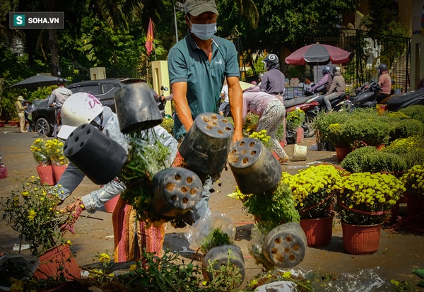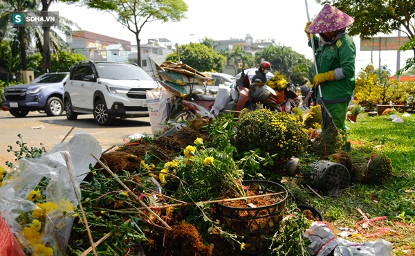 Chiều 29 Tết, tiểu thương phải dọn dẹp để trả mặt bằng ở chợ hoa đường Vành Đai Trong (Quận Bình Tân, TP.HCM). Tại gian hàng hoa của chị Bé Tư (Bến Tre), người bán vừa đập bỏ, vừa gắng gượng bán những chậu cuối cùng. Chị chia sẻ: "Chưa năm nào lỗ nhiều như năm nay. Giờ chỉ biết vừa bán vừa đập mới kịp lên xe trở về nhà. Có những chậu giảm đến nửa giá nhưng người mua vẫn bỏ đi".