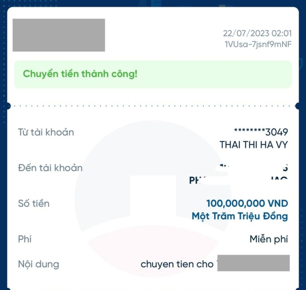 Một trong những lần chuyển khoản của Mây Bae cho anh N.