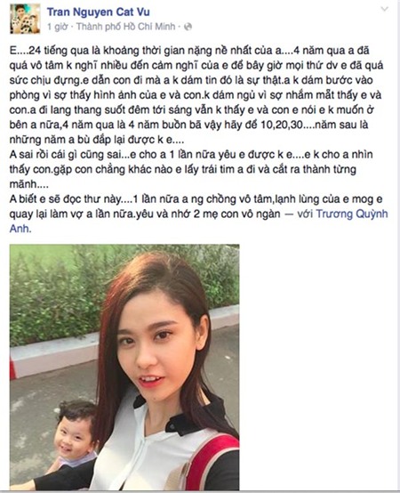 "…Anh đi lang thang suốt đêm tới sáng vẫn không thấy em và con. Em nói em không muốn ở bên anh nữa, 4 năm qua là 4 năm buồn bã vậy hãy để 10,20,30....năm sau là những năm anh bù đắp lại được không em".