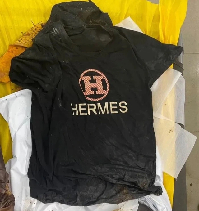 Hiện trường ghi nhận, thi thể không mặc áo, trên đùi phải có áo thun màu xanh dương đậm có dòng chữ “HERMES”.