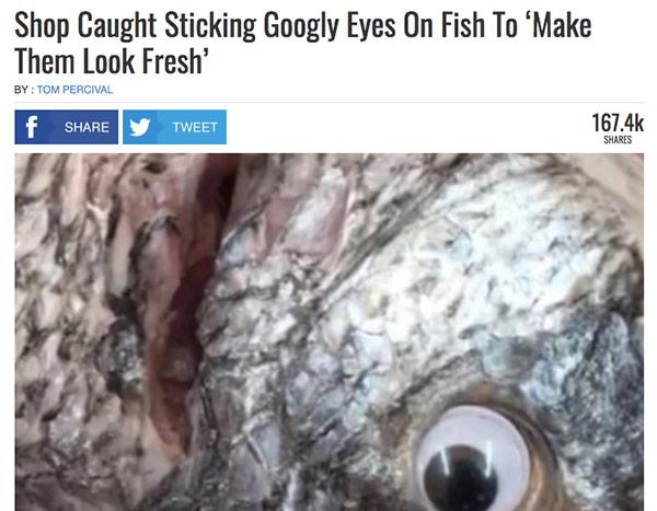 Mọi người thường truyền tai nhau cách chọn cá tươi bằng cách nhìn vào mắt hoặc mang của chúng. Để qua mắt khách hàng, chủ tiệm đã gắn những đôi mắt Googly Eyes lên cá ươn để chúng trở nên tươi rói và đầy sức sống.