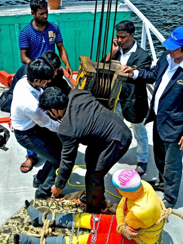 Ông Chanchal được thả xuống sông trong tư thế kỳ lạ cùng bộ trang phục sặc sỡ.