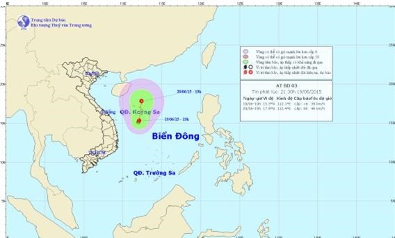 Hồi 20 giờ ngày 19/06, vị trí trung tâm vùng áp thấp ở vào khoảng 14,8-15,8 độ vĩ Bắc; 111,6-112,6 độ kinh Đông.
