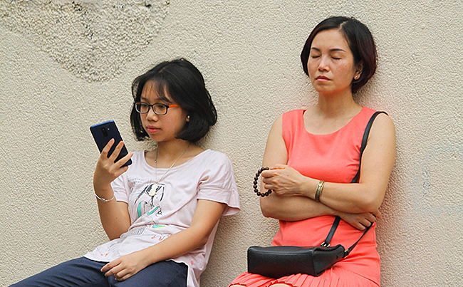Một bé một lớn đều có cách riêng giết thời gian trong lúc chờ người thân đang làm bài thi.