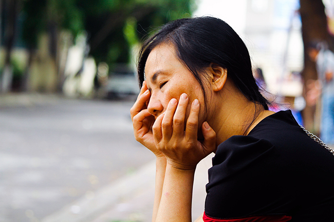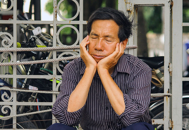 Một phụ huynh ngồi tựa tường chợp mắt dưới bóng mát.