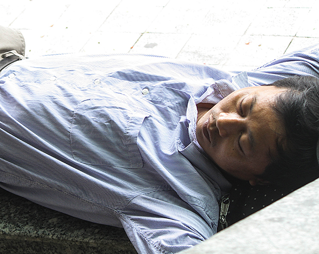 Thời tiết khá mát mẻ, người đàn ông này ngủ gục trên bậc thềm gần cổng trường THPT Nguyễn Tất Thành (Q. Cầu Giấy).