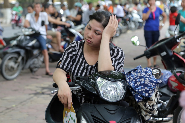 Lo lắng chuẩn bị cho con từ miếng ăn tới giấc ngủ, nhiều phụ huynh đã thức trắng đêm. Vì phải đưa con đi thi từ khá sớm nên nhiều phụ huynh trong lúc chờ đợi đã không giấu nổi vẻ mệt mỏi buồn ngủ. Trong khi đó, có những phụ huynh sốt ruột đến mức leo cả lên xe máy để ngóng vào nơi con đang thi.