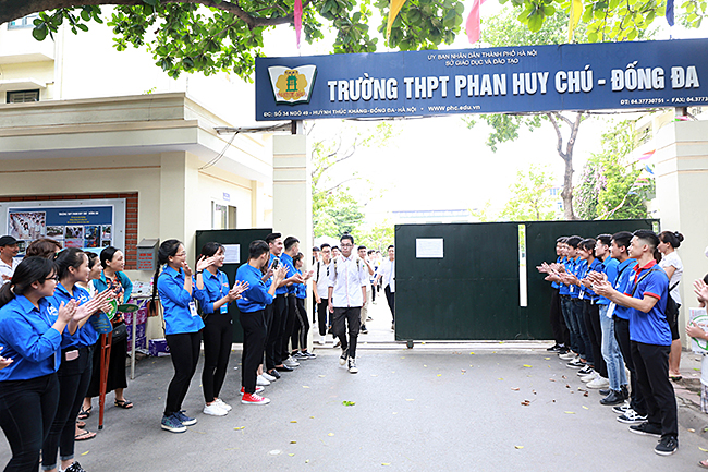 Thí sinh thi đầu tiên ở cụm thi trường THPT Phan Huy Chú bước ra khỏi cổng trường chiều hôm qua (25.6), các bậc phụ huynh đứng phía xa nôn nóng chờ đợi vỗ tay, chúc mừng các con đã hoàn thành bài thi.