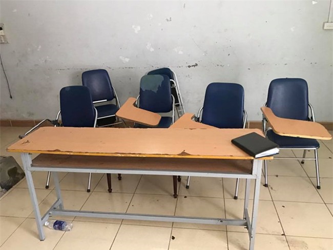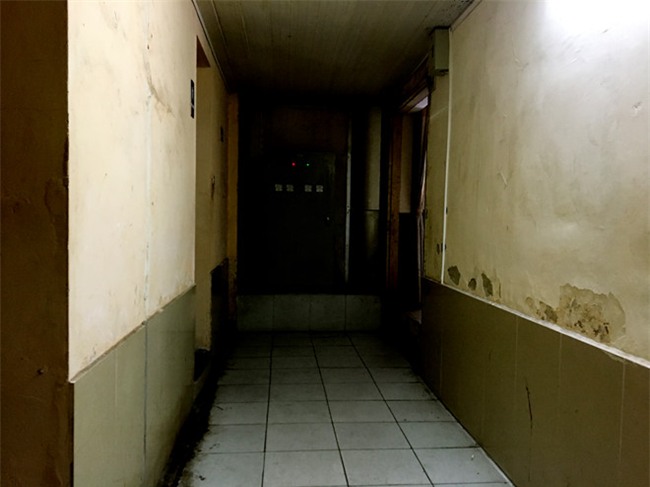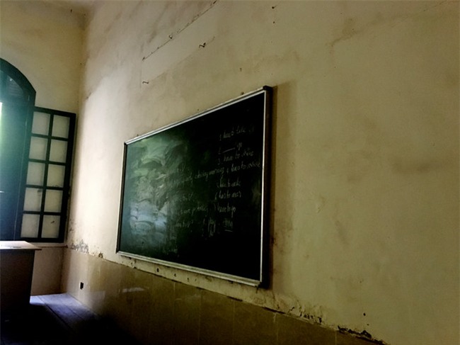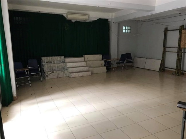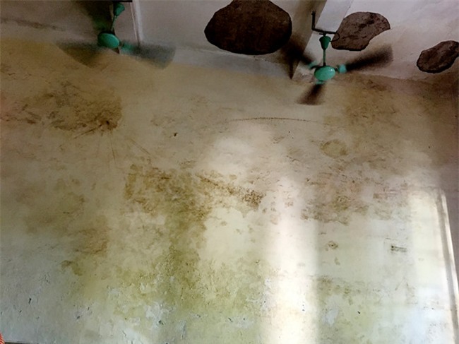 Tại lớp học thuộc tầng một, dãy nhà bên phải ngay lối vào, tường bị bong tróc, trần để lộ thành từng mảng lớn. Các góc hành lang ngổn ngang vật dụng từ điều hòa, tủ lạnh, bàn ghế cũ, xe kéo hàng...