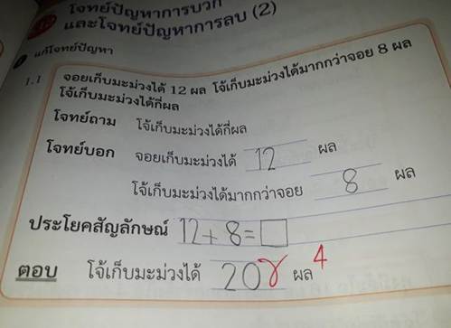 Theo đó, bài toán có ghi: "Nếu Joy có 12 quả xoài, Joy lấy thêm 8 quả xoài nữa thì bạn ấy sẽ có bao nhiêu quả xoài?". Từ đó, cháu gái của Pennapa tư duy ra bài toán "12 + 8" và kết quả đương nhiên sẽ bằng 20. Tuy nhiên, cô giáo đã đánh dấu "X" (sai) vào bài của em và ghi thêm đáp án đúng phải là 4.