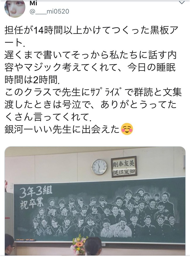 Như món quà nhân dịp mùa chia tay, một cô giáo ở Nhật đã giành hơn 14 tiếng để vẽ chân dung của 41 học sinh của mình. Điều đáng nói là tác phẩm này được vẽ tay hoàn toàn bằng phấn trên bảng của lớp học.