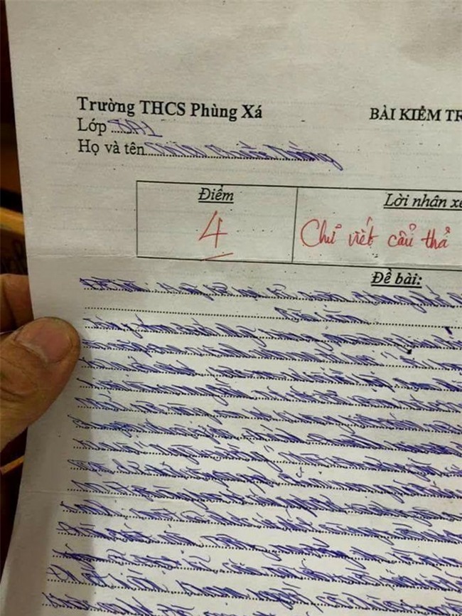 Bài kiểm tra được chấm 4 điểm cùng lời phê: "Chữ viết cẩu thả".