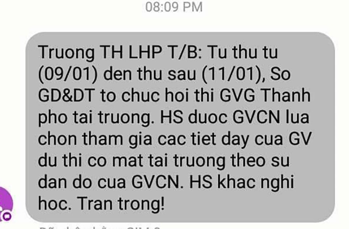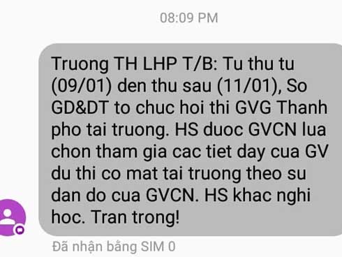 Các gia đình nhận được tin nhắn điện tử của Trường tiểu học Lê Hồng Phong với nội dung thông báo, từ thứ 4 (9/1) đến thứ 6 (ngày 11/1), Sở GD&ĐT tổ chức hội thi giáo viên giỏi thành phố cấp tiểu học tại trường.