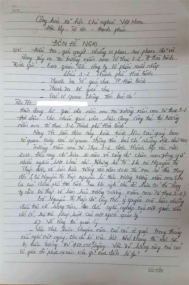 Báo Nhà báo và Công luận nhận được đơn phản ánh của một số giáo viên đang công tác tại trường mầm non chất lượng cao (của Công ty Cổ phần Xuất nhập khẩu 3-2, địa chỉ số 14 An Dương Vương, thành phố Hòa Bình, tỉnh Hòa Bình) nêu ra nhiều bất cập, tiêu cực trong nhà trường.