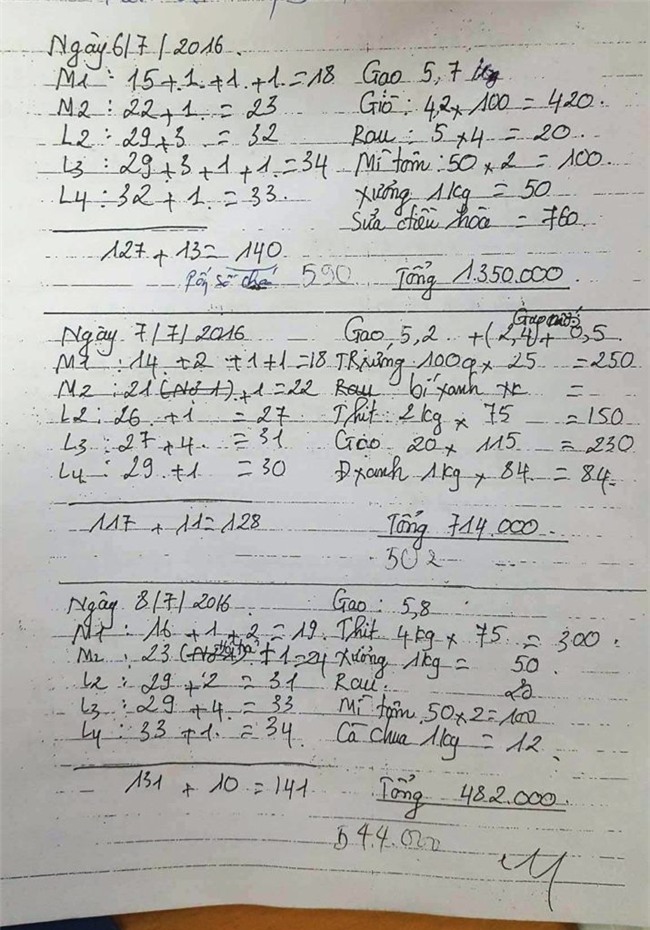 Vị này chỉ tay vào những số liệu ghi chép trong cuốn sổ, giải thích: “Đây, ví dụ như trong ngày 6/7/2016, nhà bếp nhập về 5,7kg gạo, giò 4,2kg, rau 5 mớ, mì tôm 50 gói, xương 1kg, tổng hết 590.000 đồng. Lấy số tiền này chia cho 140 cháu hôm đó đi học thì tính ra khẩu phần ăn mỗi cháu chỉ được hơn 4.200 đồng”.