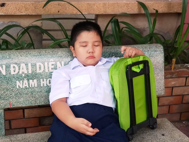 Trong khi các bạn cùng lứa đã vào lớp thì cậu bé ôm cặp ra ghế khóc đòi về với mẹ.