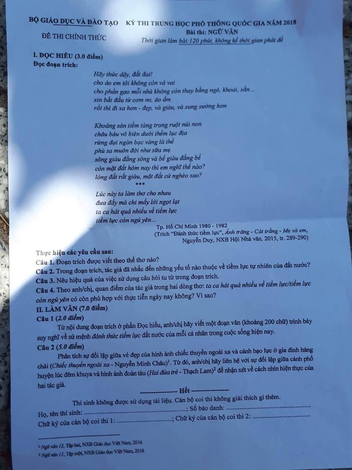 Đề thi môn Ngữ văn kỳ thi THPT quốc gia 2018 hỏi thí sinh "ta ca hát quá nhiều về tiềm lực đất nước" có còn phù hợp với thực tiễn ngày nay?