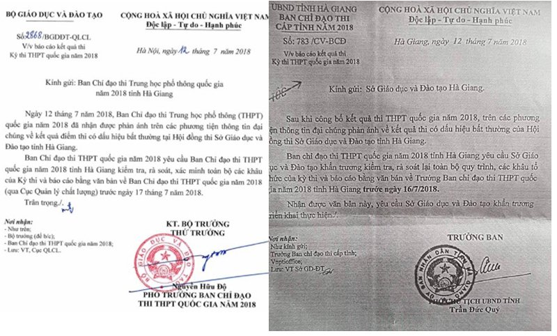Trong chiều ngày 12/7, cả Ban chỉ đạo thi THPT quốc gia của Bộ GD-ĐT và Ban chỉ đạo thi THPT quốc gia 2018 của tỉnh Hà Giang đã phát các công văn rà soát nghi vấn mà dư luận nêu ra.
