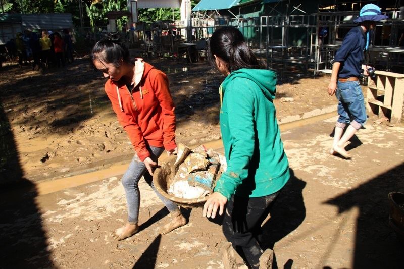 Nước lũ kéo theo bùn đất vào trường nội trú