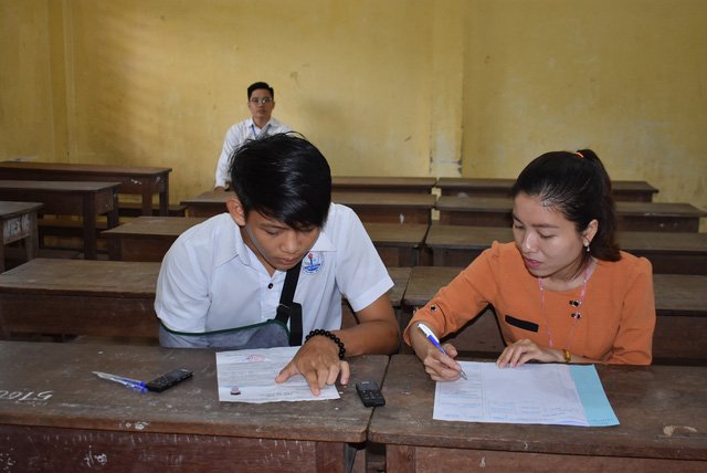 Em Sơn và nữ cán bộ coi thi sẽ viết hộ giùm em. Ảnh: Bửu Đấu