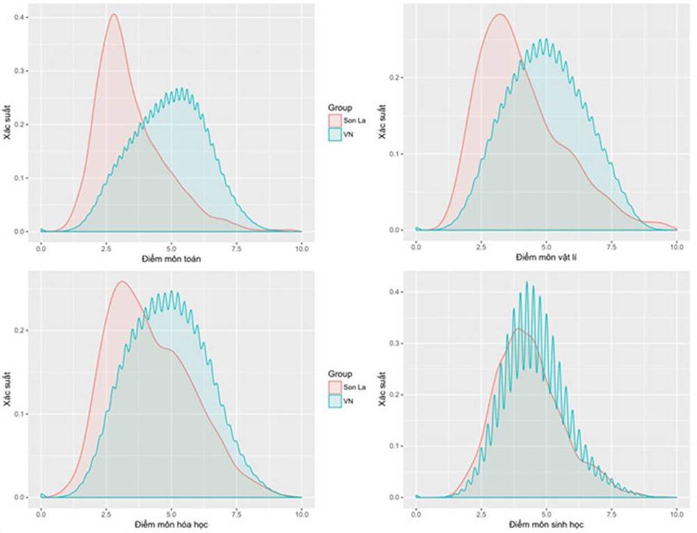 Phân bố điểm thi môn Toán, Lý, Hóa, và Sinh cho cả nước và tỉnh Sơn La. Ảnh: Nguyễn Tuấn.