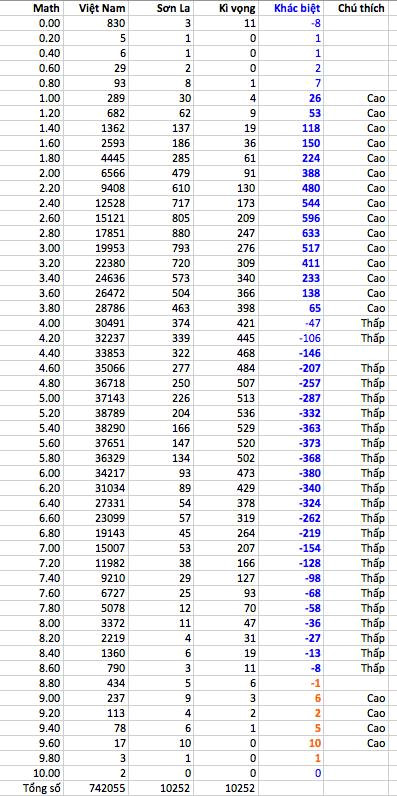 Chẳng hạn, môn Toán, điểm trung bình (độ lệch chuẩn) của Sơn La là 3.43 (1.33), so với cả nước là 4.88 (1.44). Điểm đáng chú ý là độ lệch chuẩn của Sơn La (1.33) thấp hơn so với cả nước (1.44).