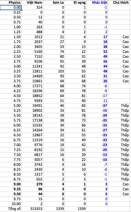 Tương tự ở môn Lý, nếu theo phân bố quốc gia, GS Tuấn kỳ vọng môn này tỉnh Sơn La có 1 thí sinh từ điểm 9 đến 9,8, nhưng trong thực tế thì có đến 13 thí sinh, tức cao gấp 13 lần.