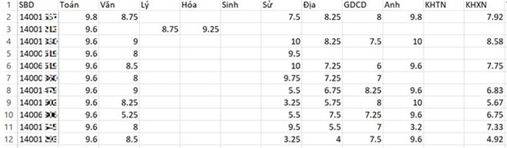 Thông tin ban đầu, ngoài trường hợp thí sinh có số báo danh 14001... chỉ dự thi Toán và bài thi Khoa học Tự nhiên, 10 thí sinh còn lại đều dùng kết quả bài thi Khoa học Xã hội để xét tuyển đại học. Đáng nói, 10 thí sinh này đều có điểm thi môn Toán rất cao, đều ở mức 9,6 và 9,8.
