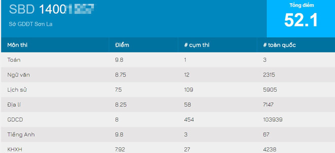 Trước đó, nhiều người đặt nghi vấn đối với trường hợp 2 thí sinh Sơn La nằm trong top 11 em có điểm cao nhất kỳ thi THPT quốc gia 2018 của Bộ GD&ĐT. Trong đó, em B.N. có điểm thi 6 môn lần lượt như sau: Toán 9,8; Ngữ văn 8,75; Lịch sử 7,5; Địa lý 8,25; Giáo dục Công dân 8; Tiếng Anh 9,8.