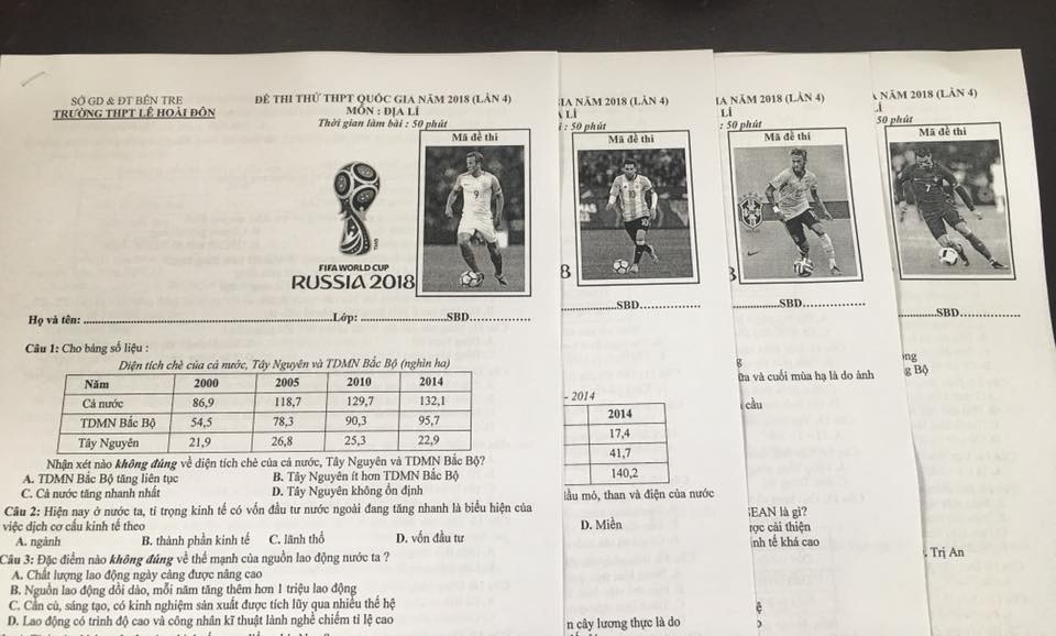 Hưởng ứng không khí World Cup đang lan tỏa trên toàn thế giới cũng như nhằm giảm căng thẳng cho học sinh trong những ngày cận kề kỳ thi THPT quốc gia 2018, thầy Lê Trung Hiếu - giáo viên dạy Địa lý trường THPT Lê Hoài Đôn (Thạnh Phú, Bến Tre) tiếp tục tái xuất siêu dễ thương với bộ đề ôn thi in hẳn logo và các cầu thủ hot nhất của giải bóng đá lớn nhất hành tinh này.