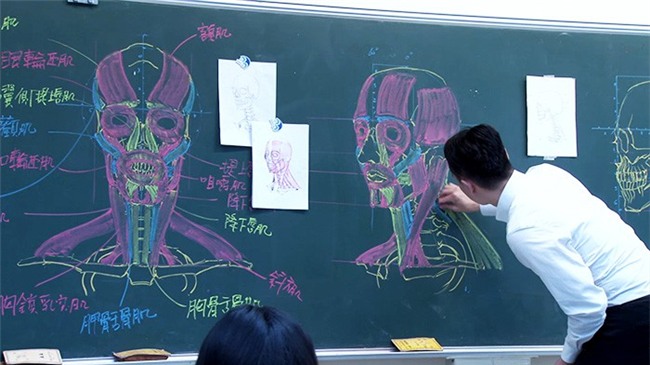 Bạn có đồng ý rằng điều khó khăn nhất thời đi học là việc học thuộc hết những kiến thức trong sách giáo khoa? Đây có thể là điều ám ảnh với bạn nhưng với sinh viên trường Đại học Shu-Te ở Đài Loan thì việc này thực sự mang lại rất nhiều hứng thú. Lí do là người thầy giáo của họ đã chuyển tất cả kiến thức trong sách giáo khoa thành hình vẽ bằng phấn trên bảng.