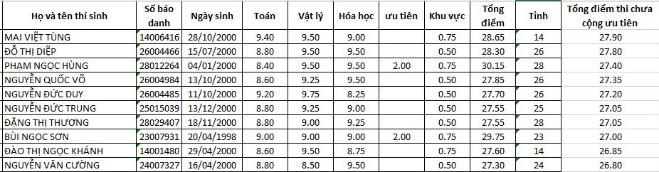 Nếu xét theo tổng điểm xét tuyển (gồm cả điểm cộng ưu tiên), điểm cao nhất là em Phạm Ngọc Hùng – thí sinh của tỉnh Thanh Hóa với tổng điểm là 30,15 (Toán 8,4; Vật lý 8,4 và Hóa học 9,5; tổng điểm cộng ưu tiên là 2,75).