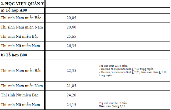 Cũng tại Học viện Quân Y, điểm chuẩn tổ hợp B00, đối với thí sinh nam miền Bắc là 22,35; thí sinh nam miền Nam là 21,05. Thí sinh nữ miền Bắc là 24,2; thí sinh nữ miền Nam là 24,15.