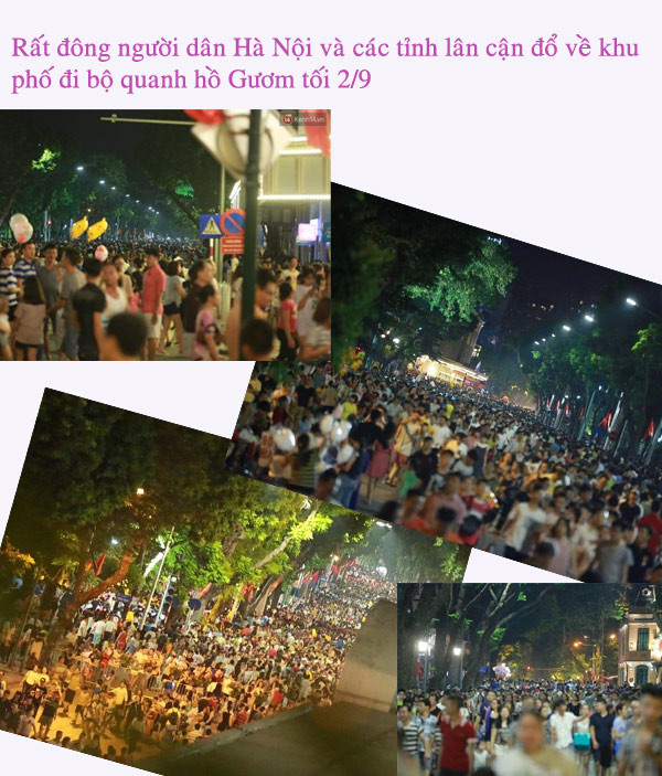 Tối 2/9, hàng vạn người đã tập trung về phố đi bộ quanh hồ Gươm. Dù không tổ chức bắn pháo hoa nhân ngày lễ độc lập nhưng người dân vẫn tỏ ra khá thích thú với các trò chơi trên khu phố đi bộ được tổ chức vào các dịp cuối tuần ở Hà Nội. Xem chi tiết TẠI ĐÂY.
