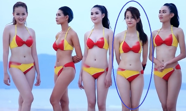 Đặc biệt, khi tạo dáng chung với các thí sinh khác, An Nguy trở nên mờ nhạt hơn hẳn vì lộ xương hông thô, vòng eo màu mỡ...
