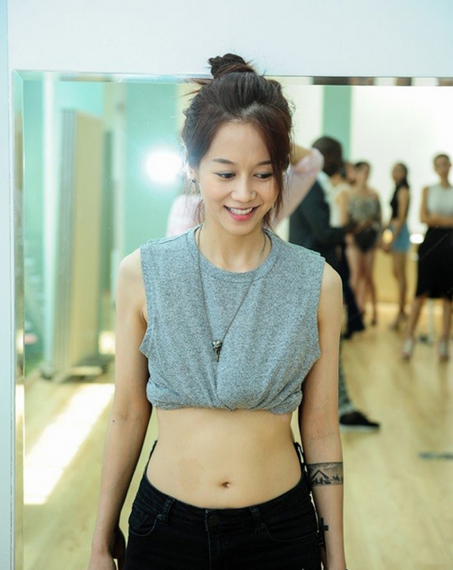Thân hình "trước sau như một" của An Nguy khi quay nghiêng tạo dáng.