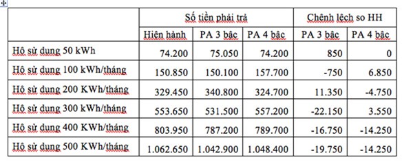 Các hộ sử dụng từ 107 kWh/tháng đến 233 kWh/tháng bị tăng tiền điện hàng tháng nhưng ngược lại, các hộ sử dụng từ 233,88 kWh/tháng trở lên lại được giảm tiền điện hàng tháng so với hiện hành. Dù vậy, mức tăng cũng khiêm tốn, như hộ dùng 150kWh/tháng chỉ bị tăng 5.300 đồng hay dùng 200kWh/tháng thì bị tăng 11.350 đồng. Còn ngược lại, dùng đến 300kWh/tháng thì sẽ được giảm tới 22.150 đồng.