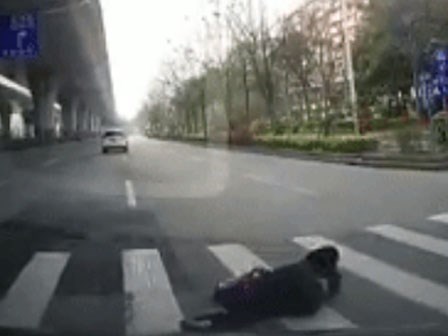 Đoạn clip ghi lại hình ảnh người phụ nữ băng qua đường bất ngờ gặp ô tô và ngã lăn ra đường dù chưa xảy ra va chạm.
