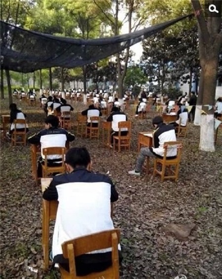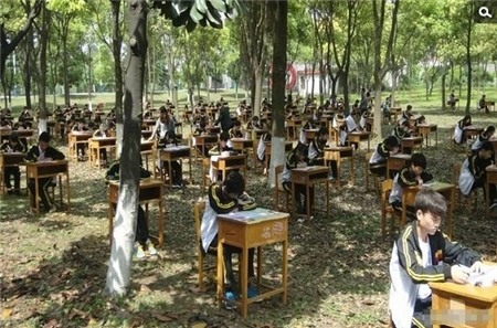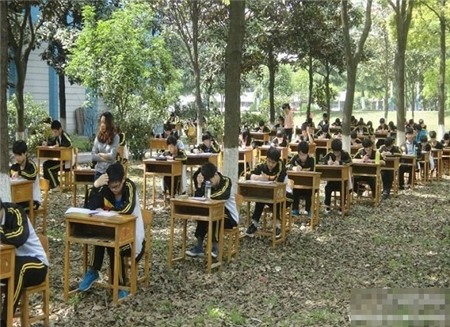 Một trường trung học tại Trung Quốc đã tổ chức thi giữa kì cho học sinh tại một rừng cây để tránh các học sinh coi chép bài và gian lận trong thi cử.