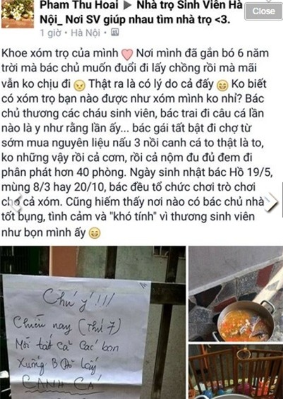 Xuất hiện trên facebook của một nữ sinh viên P.T.H, cô gái đã chia sẻ câu chuyện về chủ nhà trọ mình như thế này: "Khoe xóm trọ của mình.
