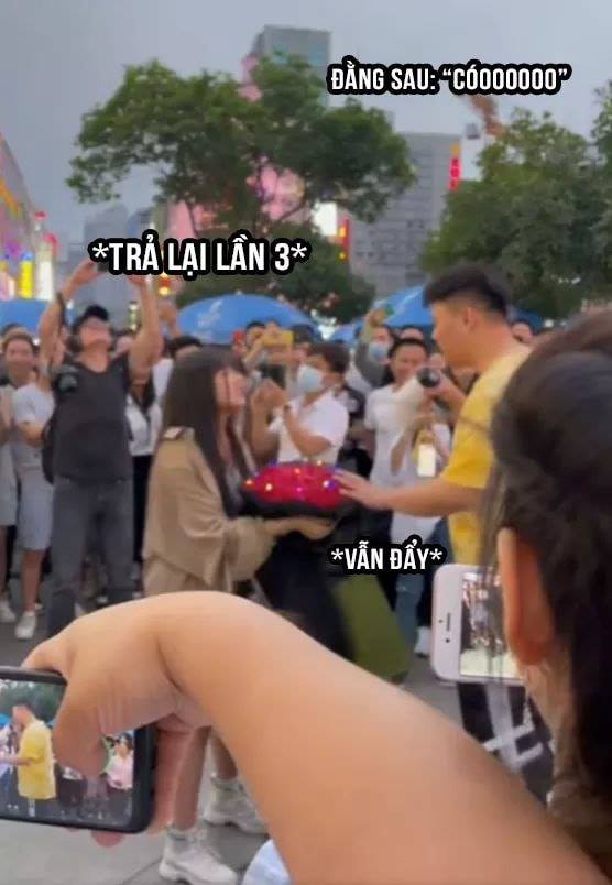 Không từ bỏ, chàng trai như ép buộc cô gái phải đồng ý, còn nhờ đám đông: "Mọi người có thể cổ vũ cho tôi không?".