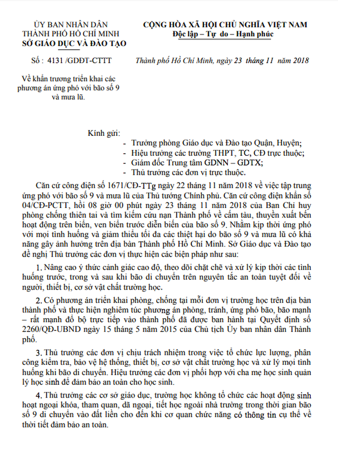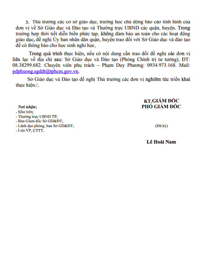 - Trong trường hợp thời tiết diễn biến phức tạp, không đảm bảo an toàn cho các hoạt động giáo dục, đề nghị UBND các quận huyện trao đổi với Sở Giáo dục và Đào tạo, thông báo cho học sinh nghỉ học.